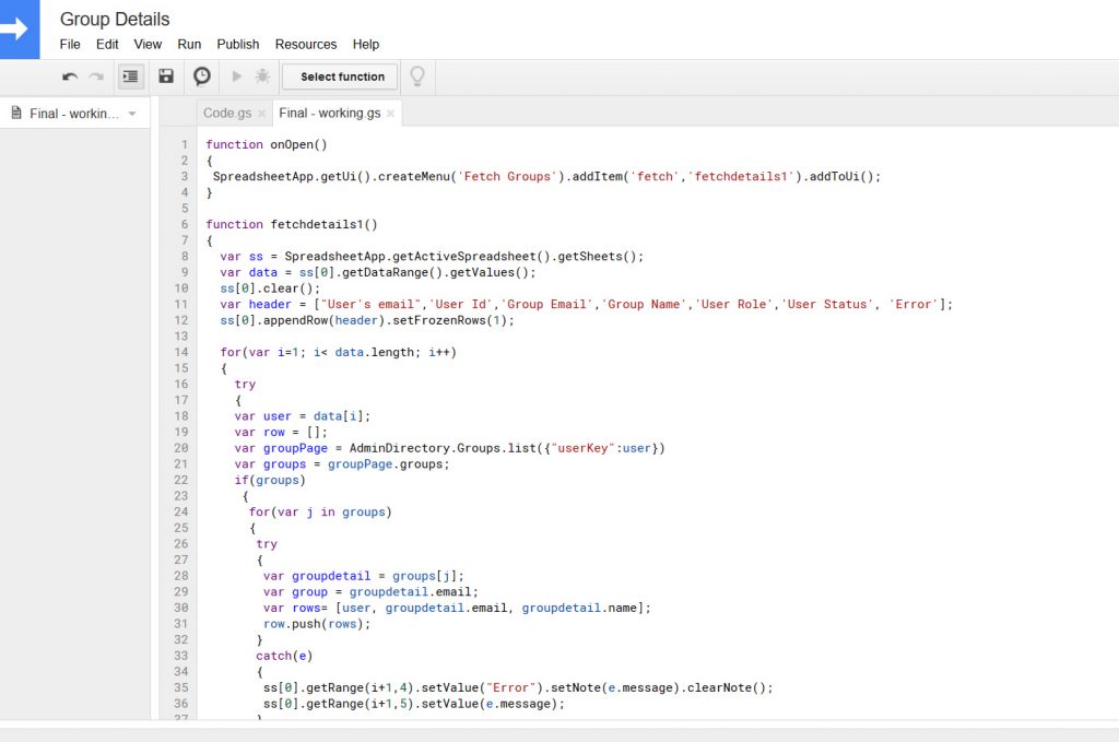 function onOpen() { SpreadsheetApp.getUi().createMenu('Fetch Groups').addItem('fetch','fetchdetails1').addToUi(); } function fetchdetails1() { var ss = SpreadsheetApp.getActiveSpreadsheet().getSheets(); var data = ss[0].getDataRange().getValues(); ss[0].clear(); var header = ["User's email",'User Id','Group Email','Group Name','User Role','User Status', 'Error']; ss[0].appendRow(header).setFrozenRows(1); for(var i=1; i< data.length; i++) { try { var user = data[i]; var row = []; var groupPage = AdminDirectory.Groups.list({"userKey":user}) var groups = groupPage.groups; if(groups) { for(var j in groups) { try { var groupdetail = groups[j]; var group = groupdetail.email; var rows= [user, groupdetail.email, groupdetail.name]; row.push(rows); } catch(e) { ss[0].getRange(i+1,4).setValue("Error").setNote(e.message).clearNote(); ss[0].getRange(i+1,5).setValue(e.message); } } } var rowlength = ss[0].getLastRow(); ss[0].getRange(rowlength+1, 2, row.length, 3).setValues(row); SpreadsheetApp.flush(); } catch(e) { ss[0].getRange(i+1,8).setValue("Error").setNote(e.message).clearNote(); ss[0].getRange(i+1,9).setValue(e.message); SpreadsheetApp.flush(); } ss[0].getRange(i+1,1).setValue(user); } fetchroles1(); } function fetchroles1() { var ss = SpreadsheetApp.getActiveSpreadsheet().getSheets(); var data = ss[0].getDataRange().getValues(); Logger.log(data); for(var i=1; i < data.length;i++) { try { var user = data[i][1]; var group = data[i][2]; var member = AdminDirectory.Members.get(group, user); var role = member.role; var status = member.status; ss[0].getRange(i+1, 5).setValue(role); ss[0].getRange(i+1, 6).setValue(status); } catch(e) { ss[0].getRange(i+1, 7).setValue(e.message); } } }